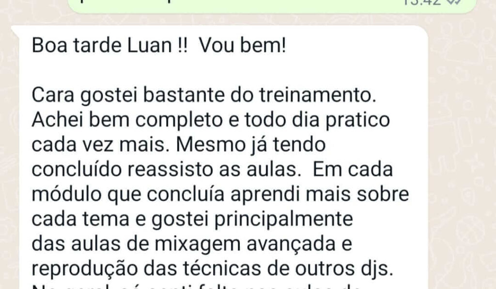“Estou muito animado para trazer a vocês meu treinamento de DJ! Nele, mostrarei o caminho do absoluto 0 para você se tornar um DJ diferenciado, executar transições criativas e profissionais de forma descomplicada, ensinarei todos os truques e técnicas mais usadas pelos maiores Djs do mundo, e todas as dicas para ajudá-lo nessa jornada, Boraaa!”